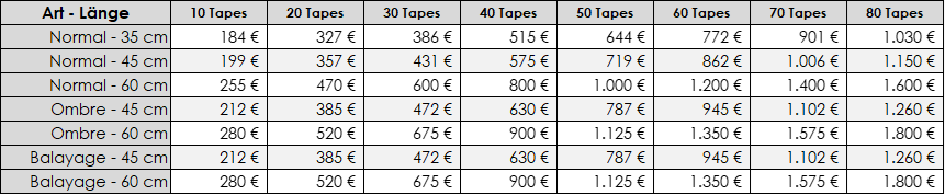 Für natürliche und flexible Haarverlängerungen bieten wir Ihnen Tape-Extensions, die sich perfekt in Ihr Haar einfügen. Entdecken Sie unsere transparenten Preise für Tape-Extensions.